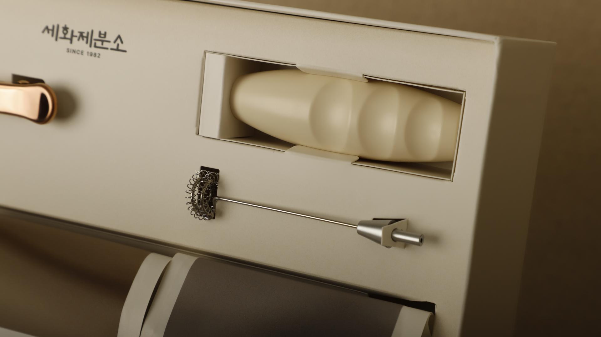 스테인리스 집게스푼과 미니 전동 휘핑기(건전지포함)가 함께 구성되어 있습니다.